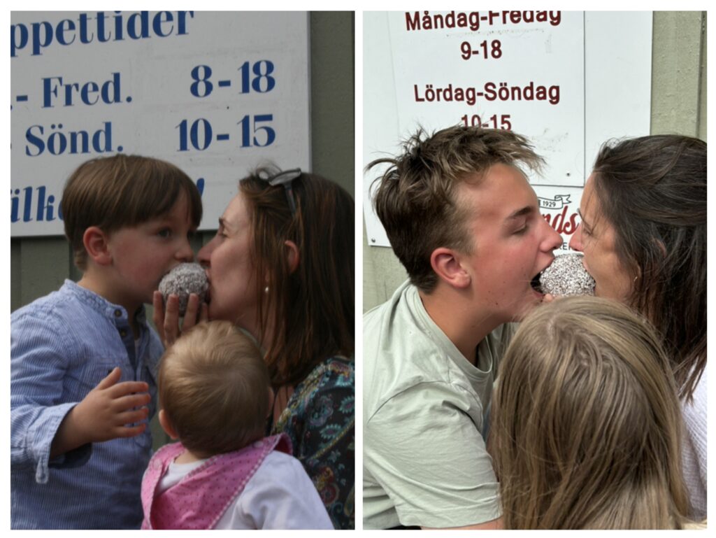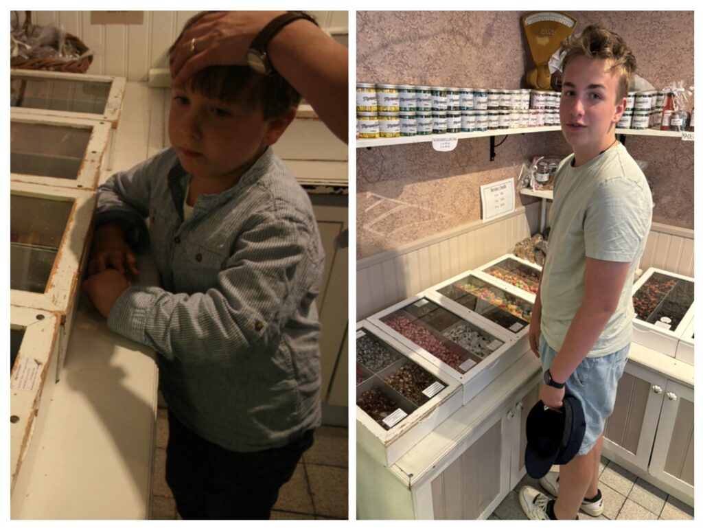 Als wir bei der Karamellkokerie ankommen, sind wir zuerst etwas verwirrt, weil es dort anders aussieht. Aber Google Maps führt uns zu dieser Adresse, und als wir genauer hinsehen, fällt uns auf, dass dort nur ein neues Schild steht und wir doch richtig sind. Wir decken uns mit Süßigkeiten ein, leider gibt es aber keine blaue Zuckerstange für das Foto von Linus, das wir nachstellen wollen. Macht aber nichts, es muss ja nicht perfekt sein! Draußen machen wir noch schnell ein paar Fotos und fahren dann durch Mariannelund. Viel mehr als die Karamellkokerie gibt es hier aber nicht zu sehen, und wir fahren weiter.