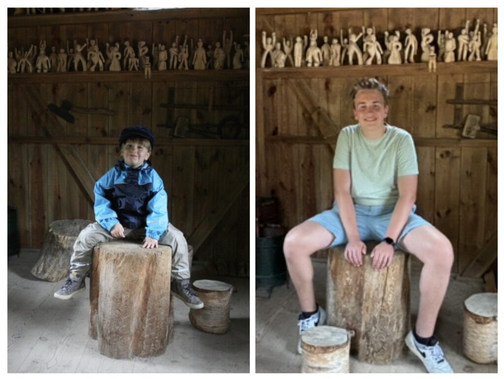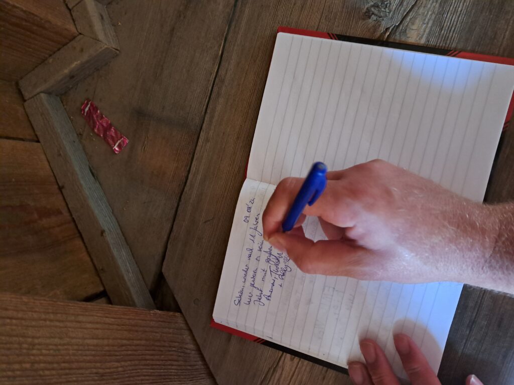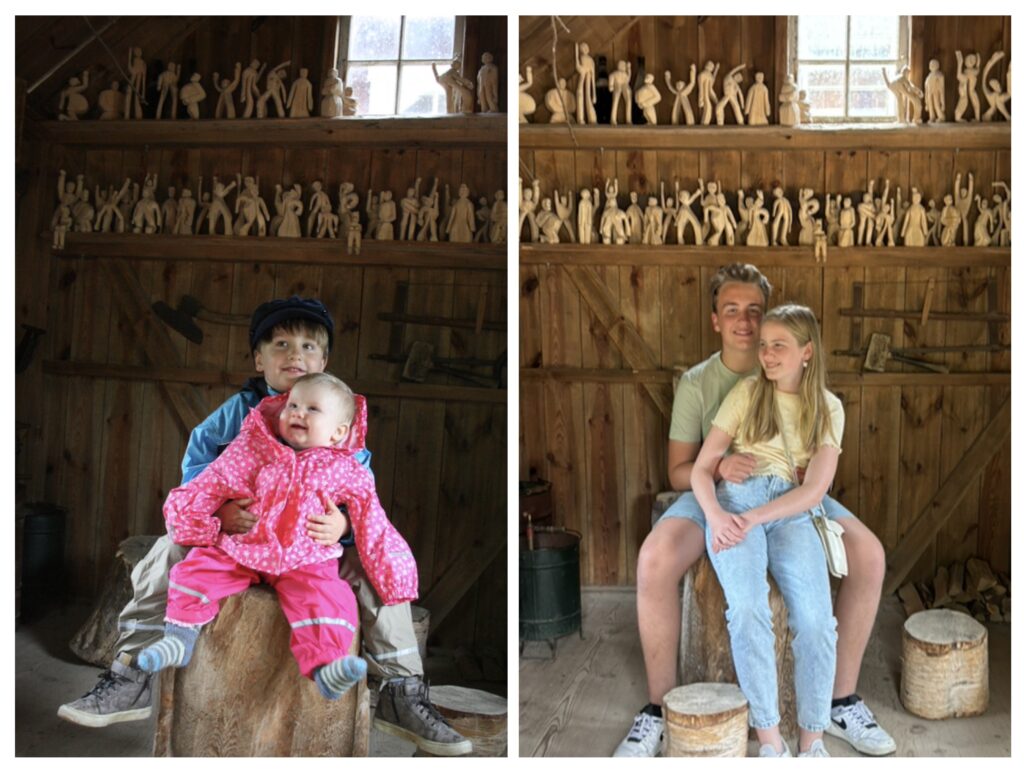 Am Wohnhaus stellen wir ein Foto von vor 11 Jahren nach und auch der Baumstumpf im Tischlerschuppen wird erneut von beiden Kindern „besetzt“. Dort tragen wir uns ins kleine Gästebuch ein und staunen: es ist nur vom August und schon proppevoll! Toll, wie viele Menschen anscheinend wie wir von den Geschichten verzaubert werden… Wir umrunden den hofeigenen See und gönnen uns an einem Tisch draußen warme Zimtschnecken aus dem Hoflädchen – mmhhh, so lecker!