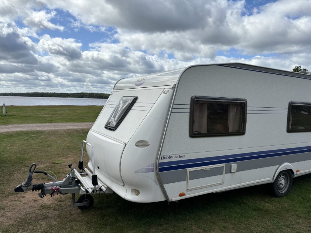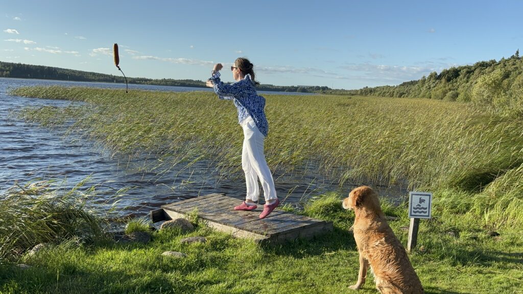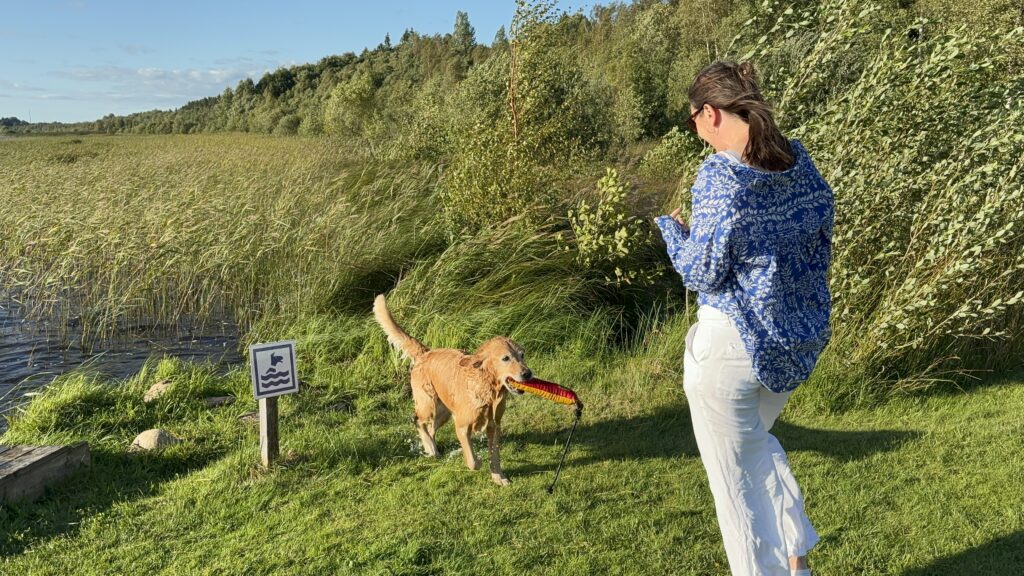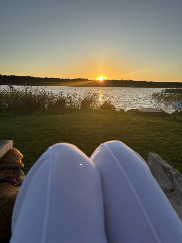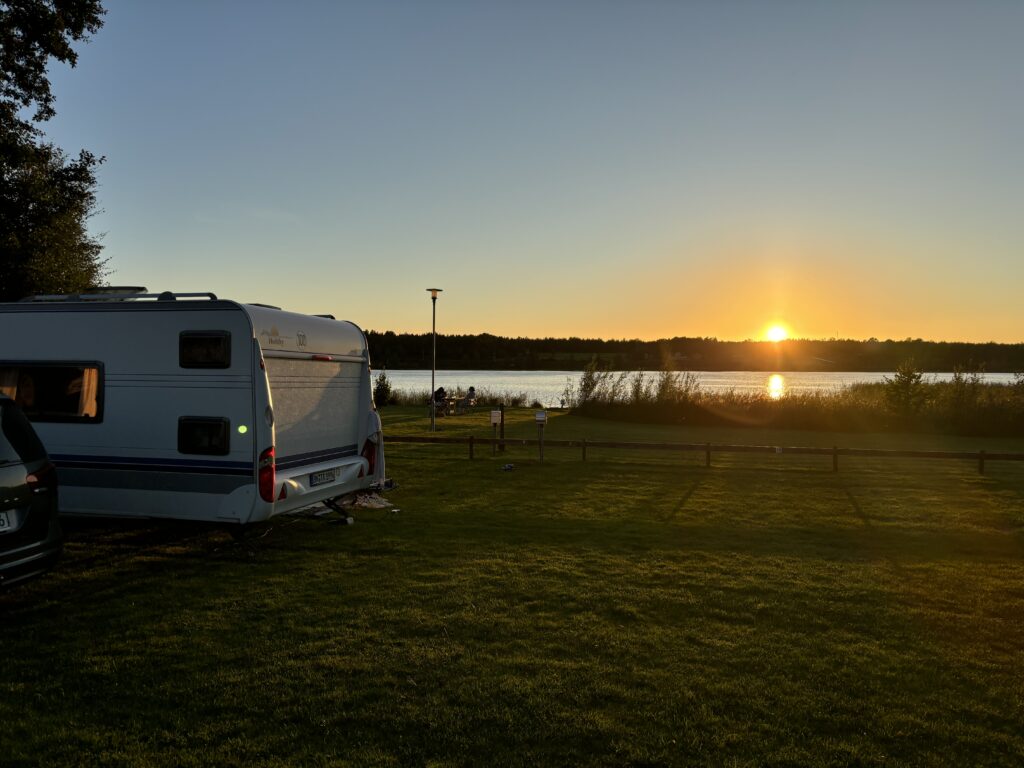 Wir kommen dort an und finden einen sehr kleinen, unglaublich schönen Campingplatz an einem ruhigen, kleinen See, fernab der Straße und hinter einem Bauernhof gelegen. Erstaunlicherweise ist es auch ziemlich leer, und das Feld, Platz Nummer 13, wo wir unsere Molly abstellen, gehört uns quasi alleine. Direkt vor uns, in Richtung See, befindet sich unser privater kleiner Tisch und der Hundesteg, über den sich Polly natürlich sehr freut. Sie schwimmt ausgiebig im See und hat einen Riesenspaß, durch das Schilf zu schwimmen.