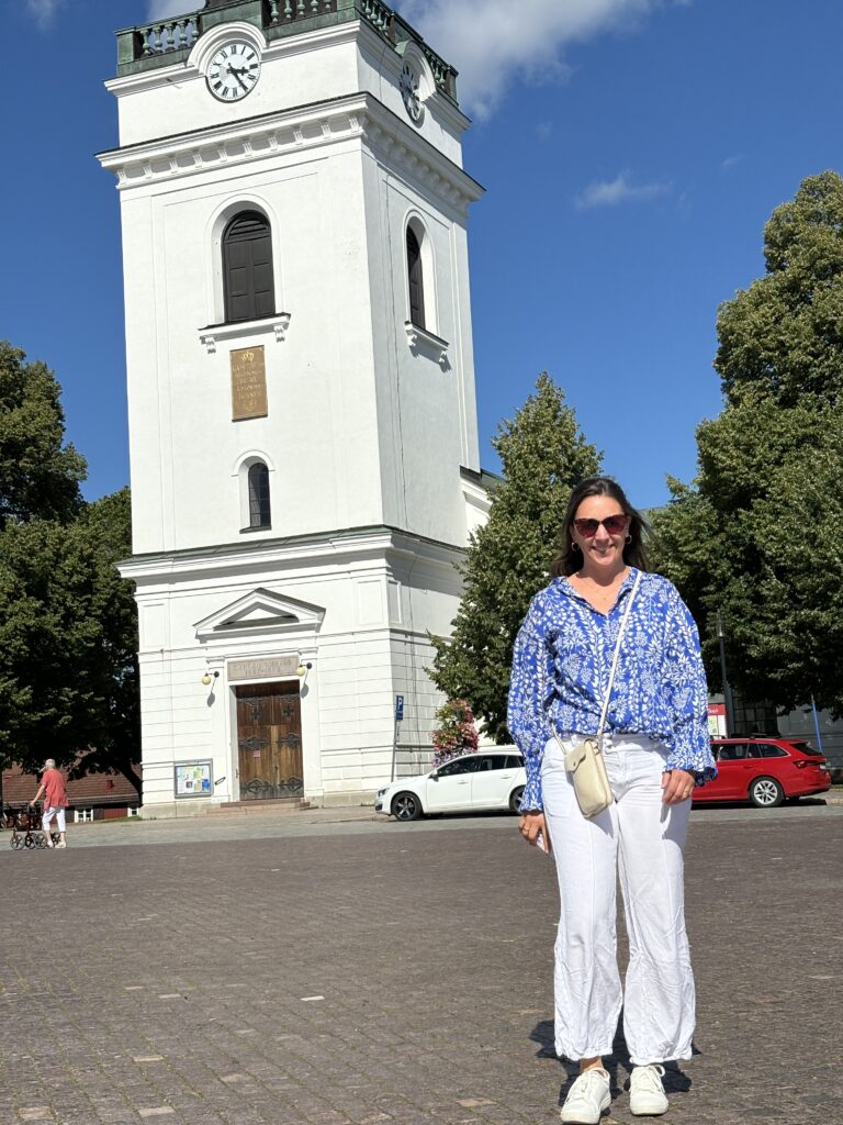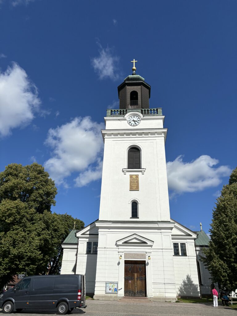 In Eksjö angekommen, parken wir auf dem großen Platz bei der Kirche und schlendern durch die Straßen. Eksjö ist wirklich wunderschön. Viele alte Häuser, kleine Cafés, verwinkelte Straßen, und Hinterhöfe, in denen Cafés sind – die leider geschlossen sind, aber das stört uns nicht. An einer Brücke über einem Bach gibt es ein Restaurant mit einer schönen Terrasse, und auch die Häuser haben ihre Balkons in Richtung des Baches ausgerichtet. Wirklich wunderschön und verzaubert!