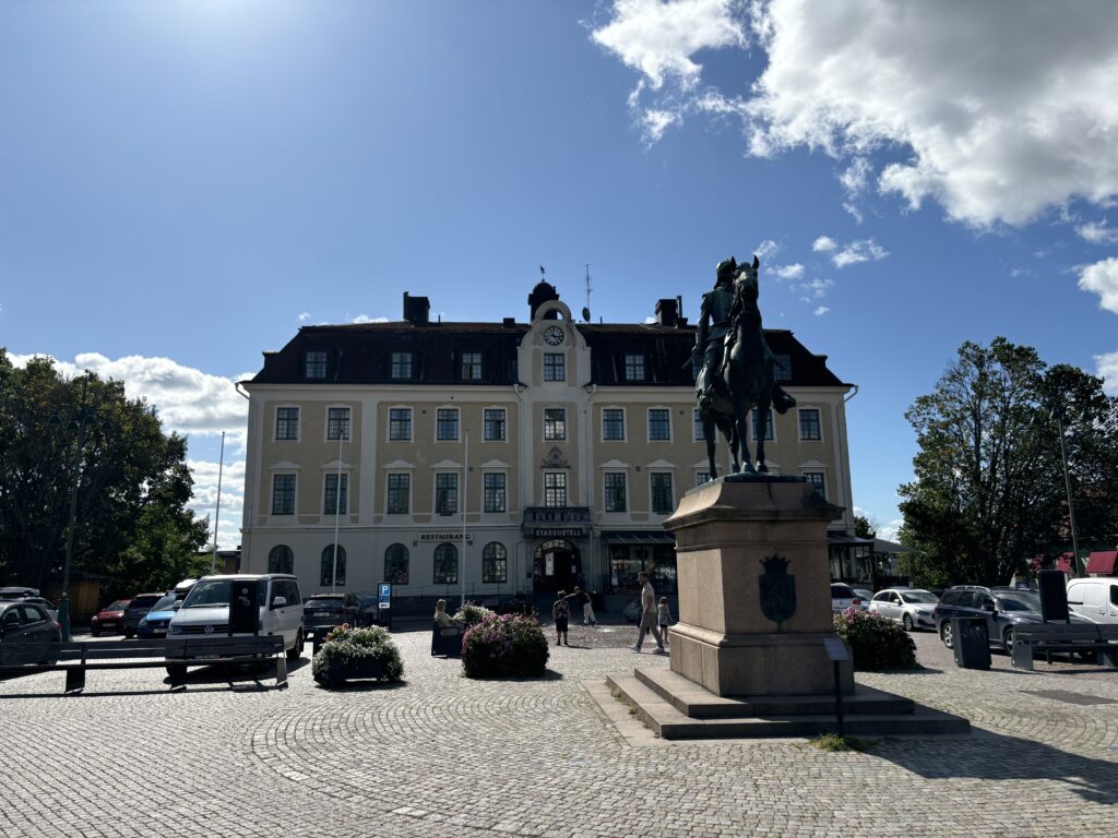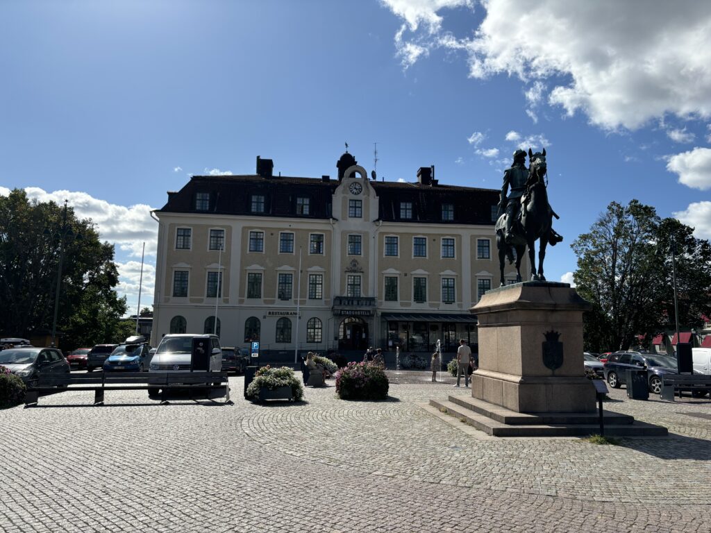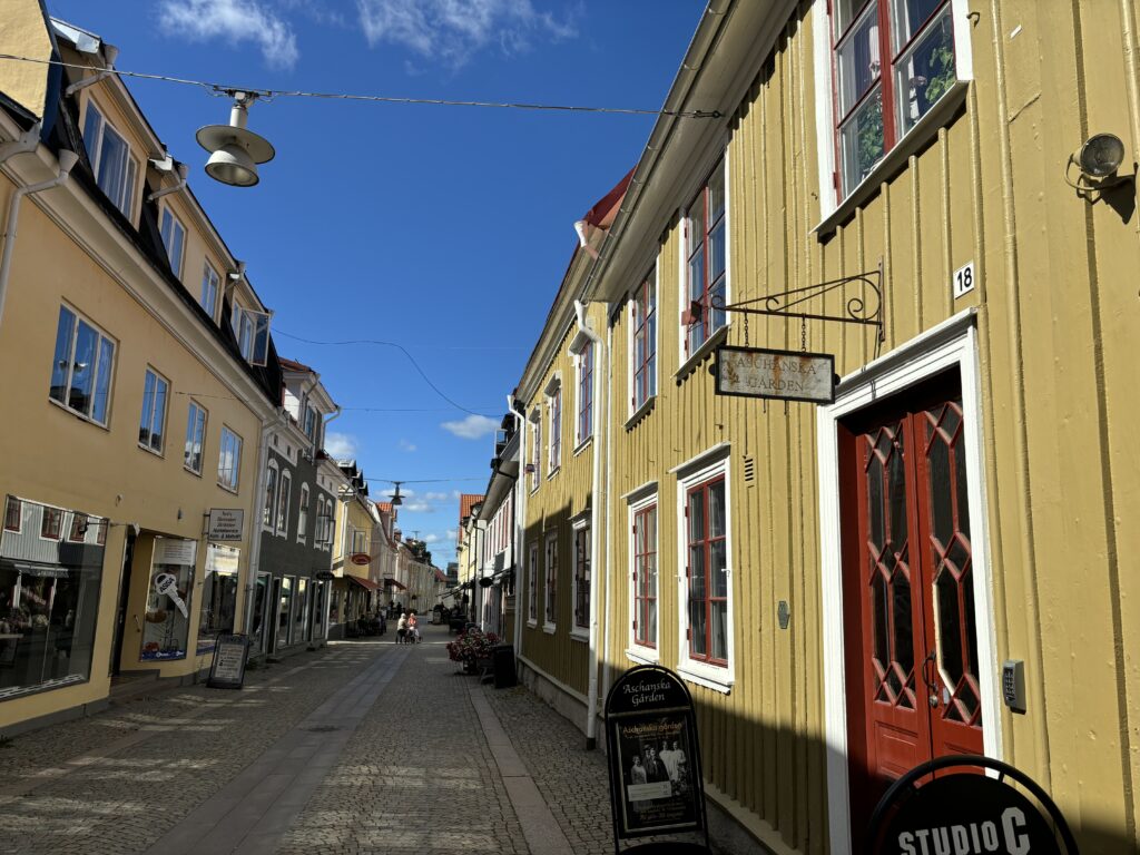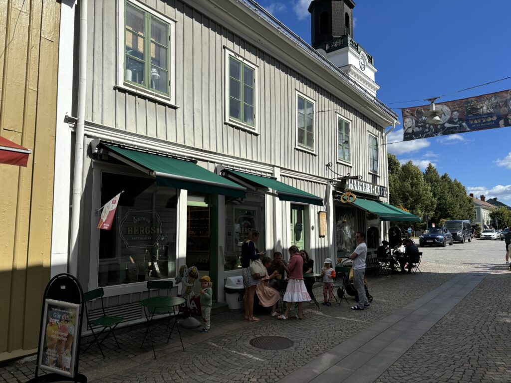 Wir möchten gerne Kaffee trinken und ein Stück schwedische Leckerei essen, aber interessanterweise schließt Lennarts Café, wie so viele andere Cafés in Schweden, schon um 16 Uhr, und wir sind erst kurz vor vier dort. Daher nehmen wir einige Leckereien zum Mitnehmen und setzen uns auf dem großen Platz an einen der bereitstehenden Tische. Nachdem wir diese genossen haben, schlendern wir noch durch eine andere Straße. Linus schaut, wie immer, nach Immobilien in Schweden, was man denn hier so kaufen könnte, und danach fahren wir zurück.