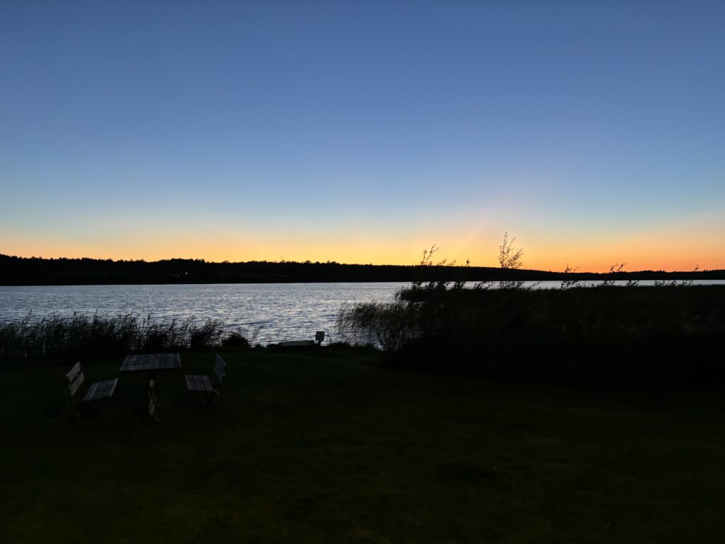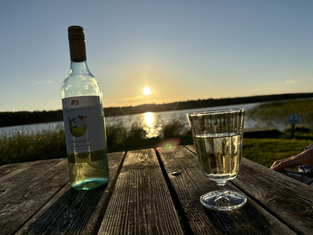 Wir fahren zurück zum Platz und machen uns einen gemütlichen Abend. Es gibt Sahneheringsfilet mit Kartoffeln. Wir trinken Wein im Sonnenuntergang und genießen unseren wunderschönen Platz. Der Wein ist alkoholfrei und schmeckt ganz o.k.; richtigen Wein gab es nicht im Supermarkt. Bis spätabends sitzen wir draußen, auch wenn es dann etwas frisch wird. Danach machen wir es uns in unseren Betten gemütlich.
