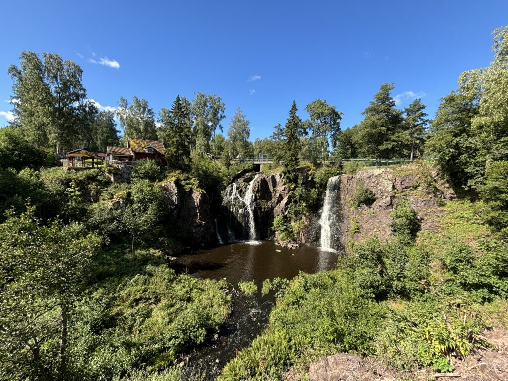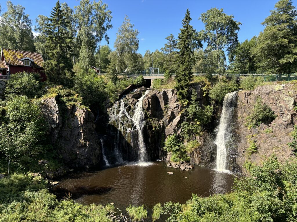 Wir fahren los in Richtung der Stadt Gränna, die bekannt ist für ihre Zuckerstangenproduktion, die dort Polkagrisor genannt werden. Die Fahrt dauert eine knappe Stunde. Unterwegs halten wir noch am höchsten Wasserfall von Småland und schauen ihn uns an. Der fast 20 Meter hohe Wasserfall ist wirklich beeindruckend. Wir kommen nahe an der Stadt Tranås vorbei, wo Rieke vor fast 50 Jahren einen Sommerurlaub verbracht hat.