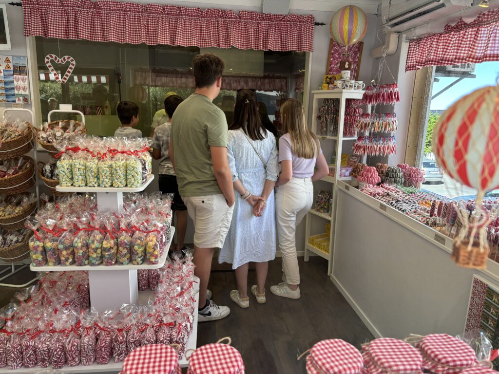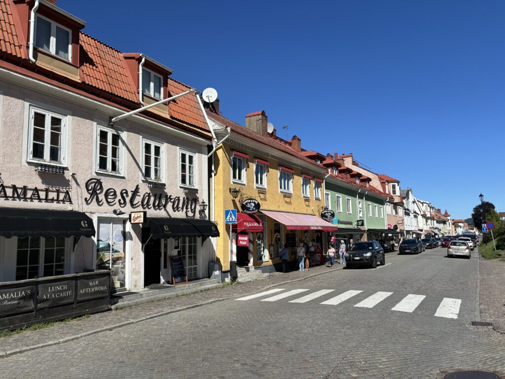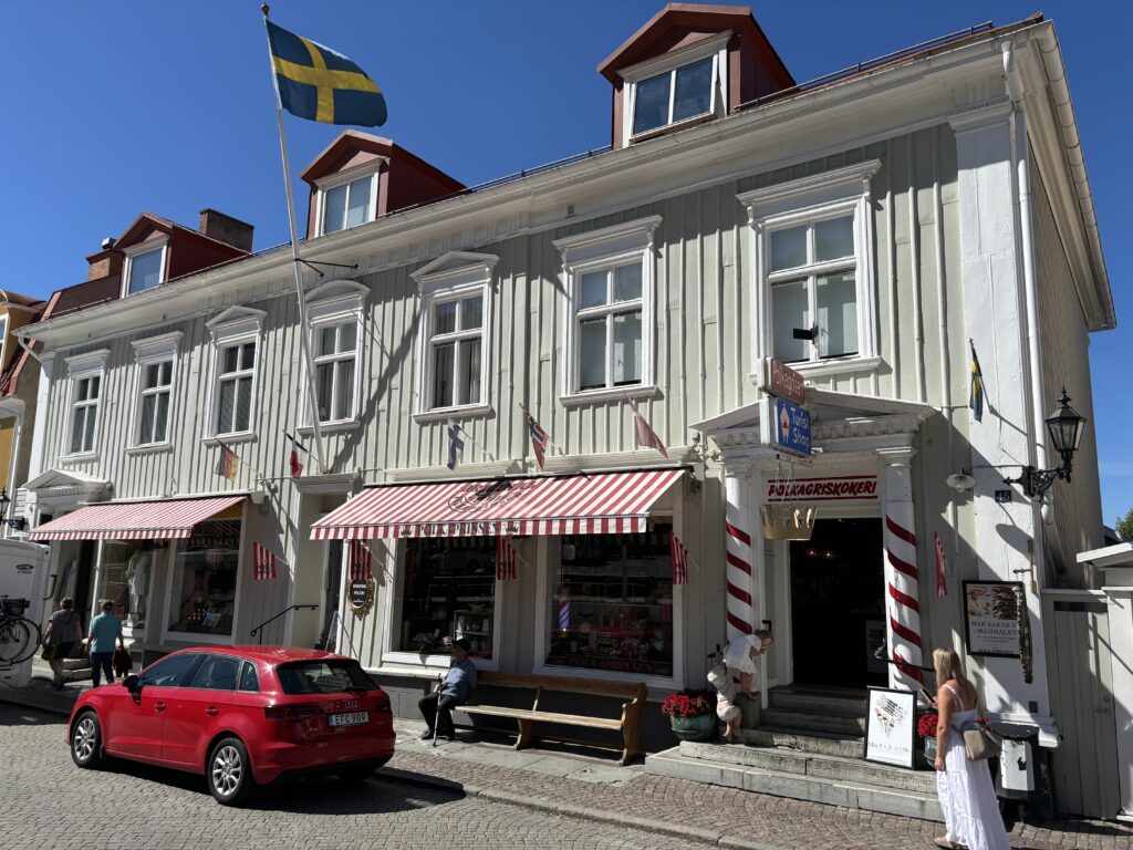 Als wir in Gränna ankommen sehen wir, dass es dort wirklich sehr schön ist. Die Hauptstraße ist mit vielen hübschen Geschäften gesäumt, und es sieht insgesamt fast ein wenig wie am Gardasee aus. Allerdings ist es uns hier nach all der Ruhe an unseren anderen Orten doch etwas trubelig – auch das erinnert an manche touristische Stellen am Gardasee. Eine Zuckerstangenmanufaktur liegt neben der nächsten. Es gibt nur wenige andere Geschäfte, aber alles ist schön bunt und nett anzusehen.