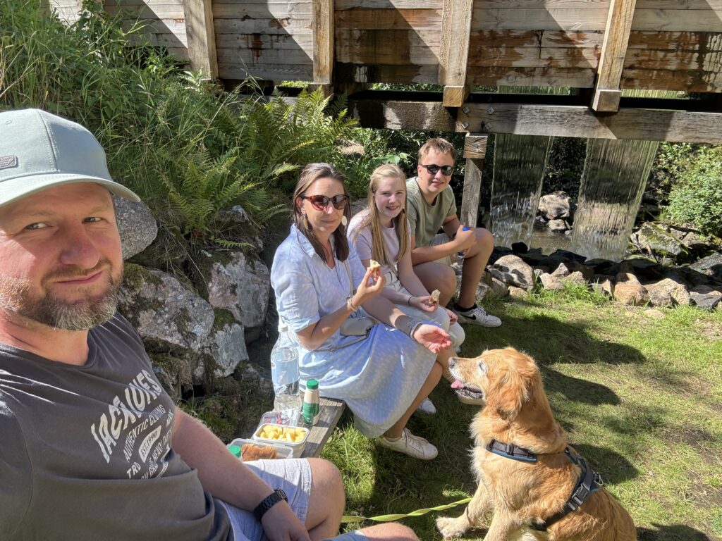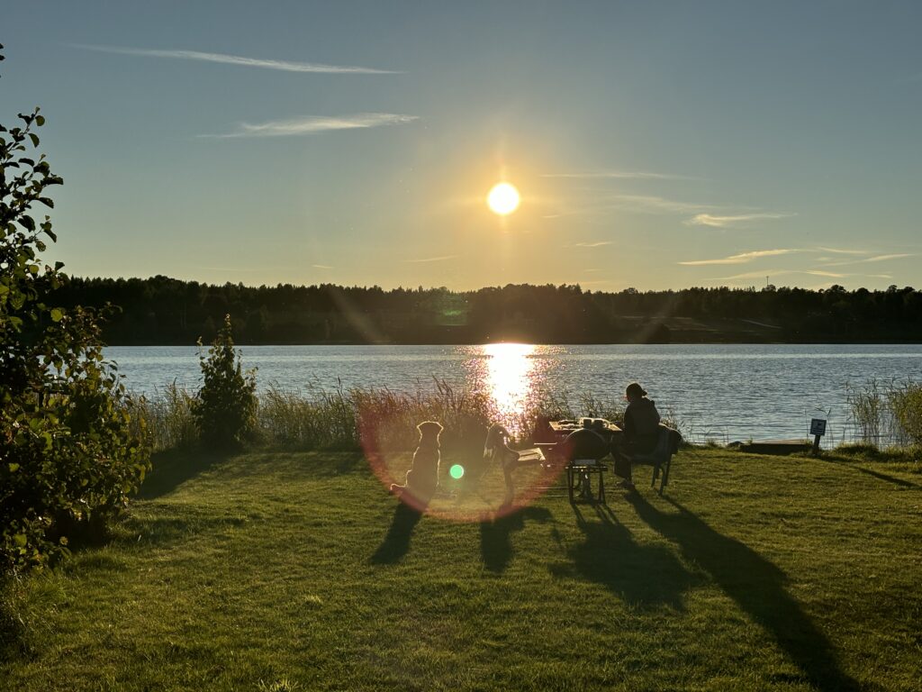 Wie so oft in diesem Urlaub wachen wir heute bei strahlendem Sonnenschein auf. Es ist eine echte Freude, die Tür von Molly zu öffnen und direkt auf den See zu blicken. Polly nimmt sofort ihr morgendliches Bad, und nach einem kleinen Spaziergang von Thorsten und Polly in Richtung Wald, entlang des kleinen Wanderwegs, der direkt vom Campingplatz Målsånna Camping wegführt, frühstücken wir an unserem Holztisch direkt am See. Es ist wirklich eine wunderschöne Kulisse und ein wunderbares Frühstück. Wir machen aber etwas schnell, weil wir heute einen Ausflug an den Vätternsee machen wollen.