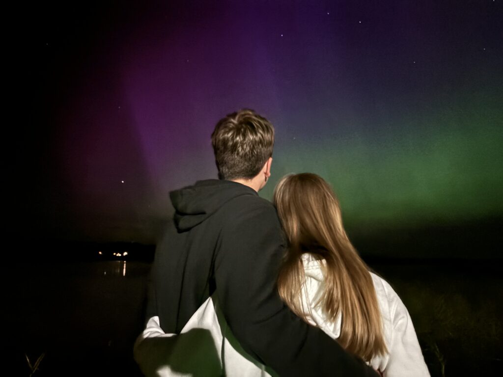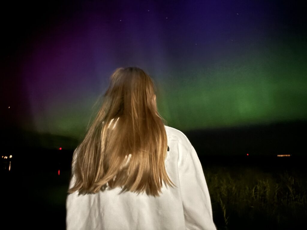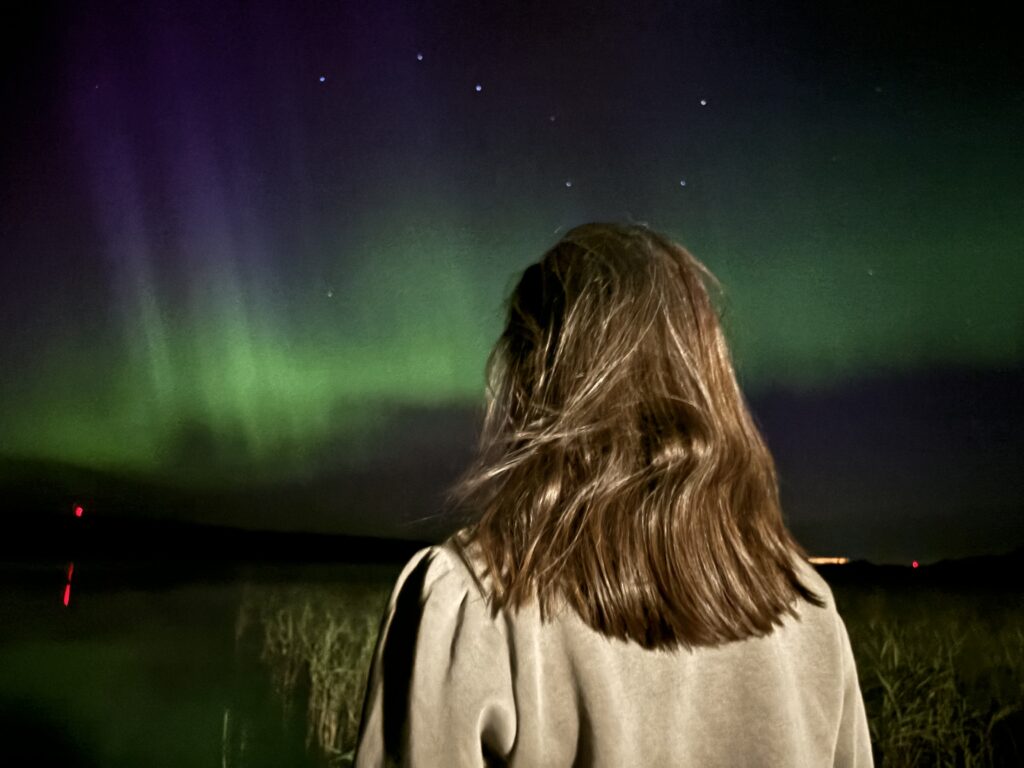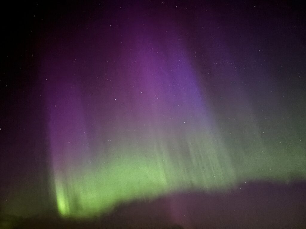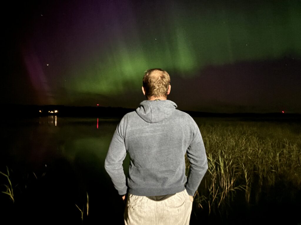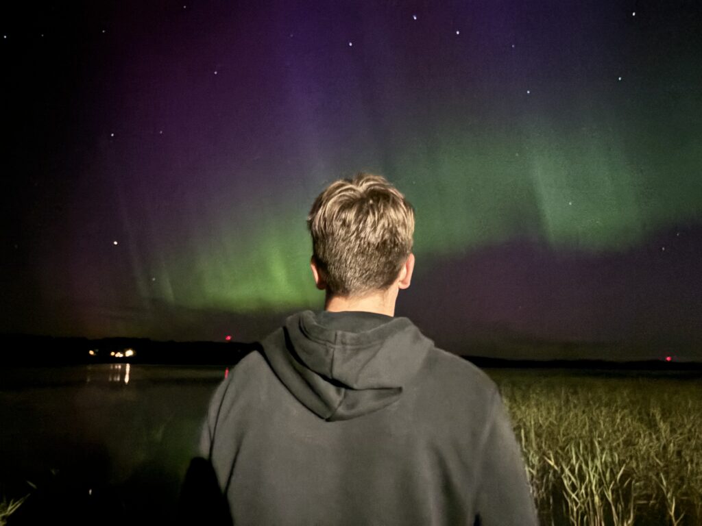 Später, als es dunkel ist, halten wir wieder nach Sternschnuppen Ausschau. Besonders Linus ist sehr eifrig dabei. Nach kurzer Zeit kommt er aufgeregt zur Molly gerannt und sagt, dass er glaubt, Polarlichter zu sehen. Wir gehen alle nach draußen, und tatsächlich sieht man in Richtung Norden ein schwaches Leuchten am Himmel. Thorsten und Linus machen einen kurzen Spaziergang in den Wald zu einer Lichtung, wo es weniger störende Lichtquellen gibt. Dort sieht man die Polarlichter dann deutlicher, und mit dem Handy können wir wunderbar das grüne Licht dieser einfangen.