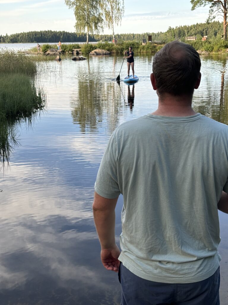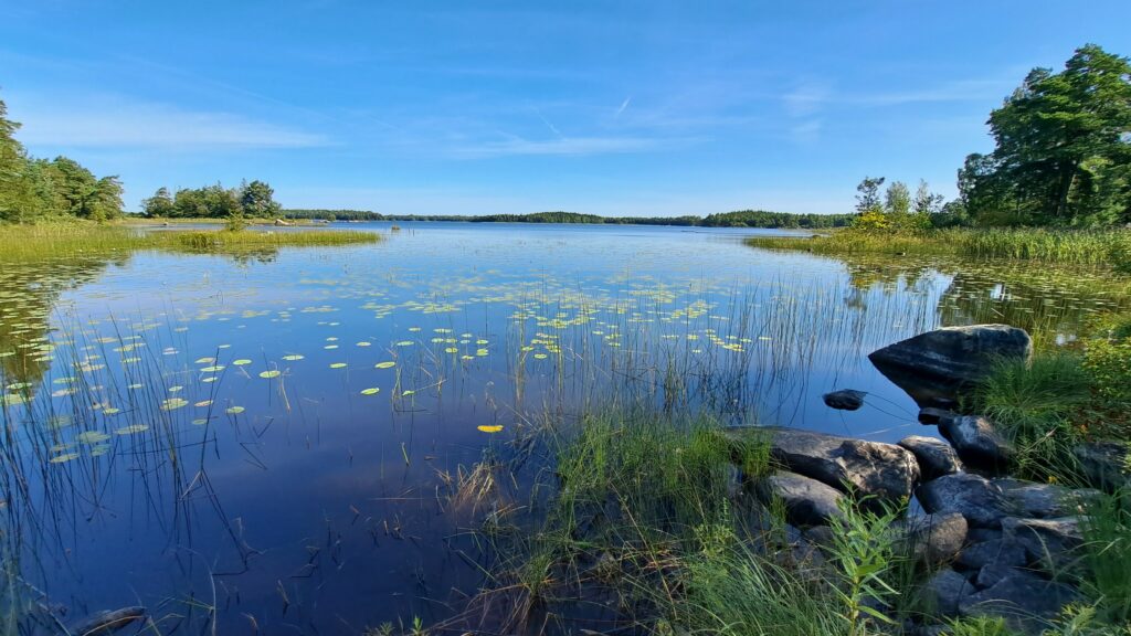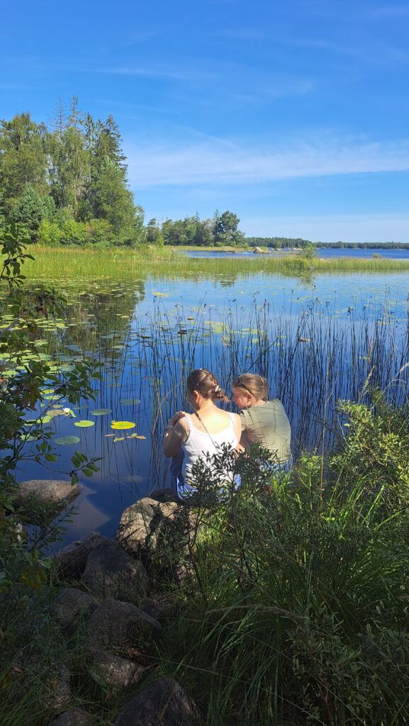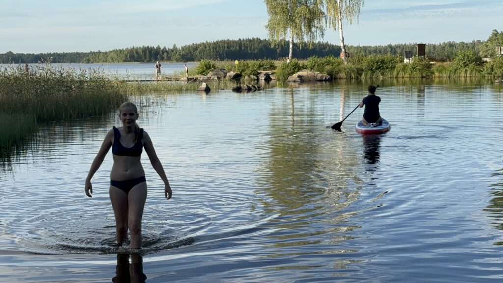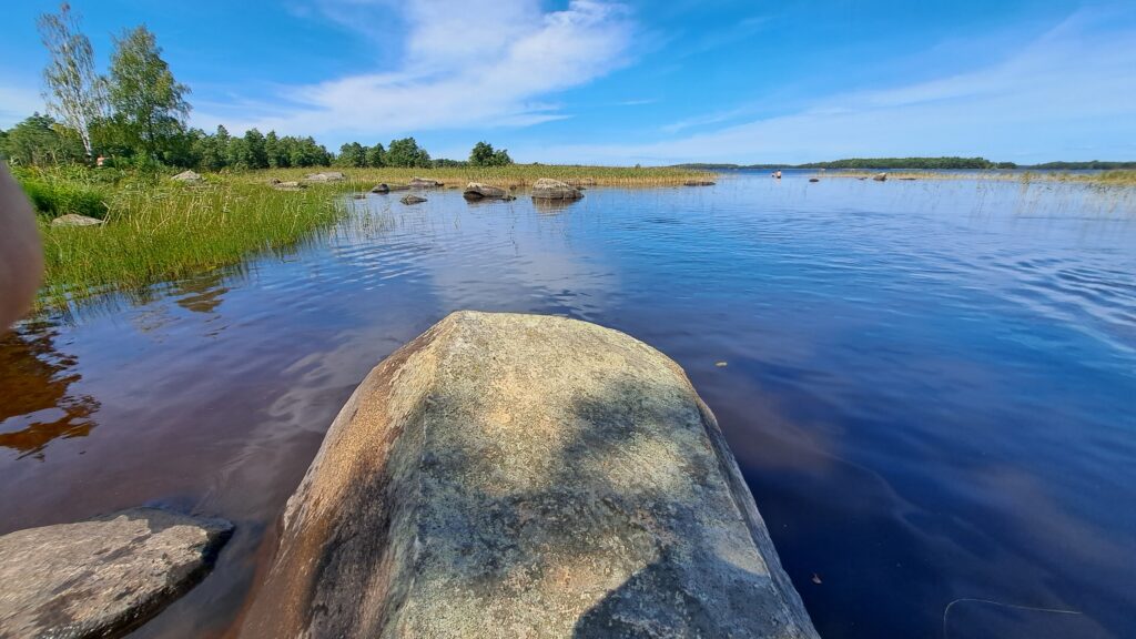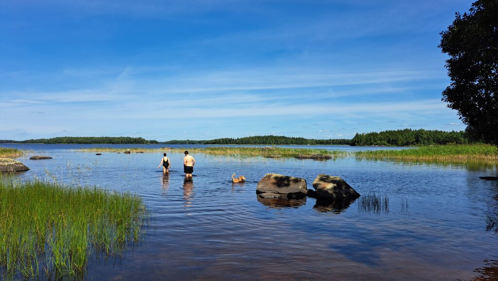 Heute ist unser erster vollständiger Tag am Åsnen-See, und es fühlt sich sofort nach Urlaub an. Zum Abschluss unserer spannenden Reise wollen wir hier noch einmal richtig die Seele baumeln lassen. So schlafen wir in Ruhe aus, denn selbst die Brötchen kann man erst ab 9 Uhr abholen. Wir frühstücken im Sonnenschein an unserem Holztisch direkt am See, und danach gehen wir zum Wasser. Mone und Linus trauen sich als Erste hinein und schwimmen aus der Bucht heraus bis zu einem Sonnendeck, das einige Dutzend Meter außerhalb der Bucht liegt. Polly badet natürlich auch, und Thorsten setzt sich auf einen Felsen mitten im Wasser.