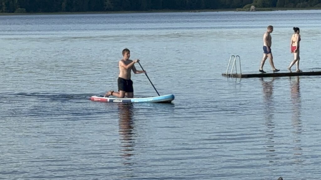Zum Mittag essen wir Haferbrei, und danach müssen wir einkaufen gehen, denn Linus und Mone wollen heute eine Überraschung kochen. Linus und Thorsten fahren zusammen zum Einkaufen, und anstatt den Supermarkt zu nehmen, der „nur“ 20 Minuten vom Campingplatz entfernt liegt, fahren sie ganze 40 Minuten bis zum nächsten Lidl. Denn wir hatten gesehen, dass Lidl aktuell ein Stand-Up-Paddle-Board im Angebot hat, und darauf haben wir es abgesehen. Wir kaufen alles ein, was wir brauchen, und finden tatsächlich noch das letzte Allround-SUP, das wir sofort kaufen. Schnell zurück zum Campingplatz!