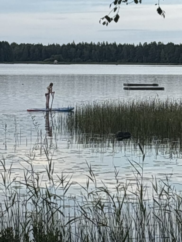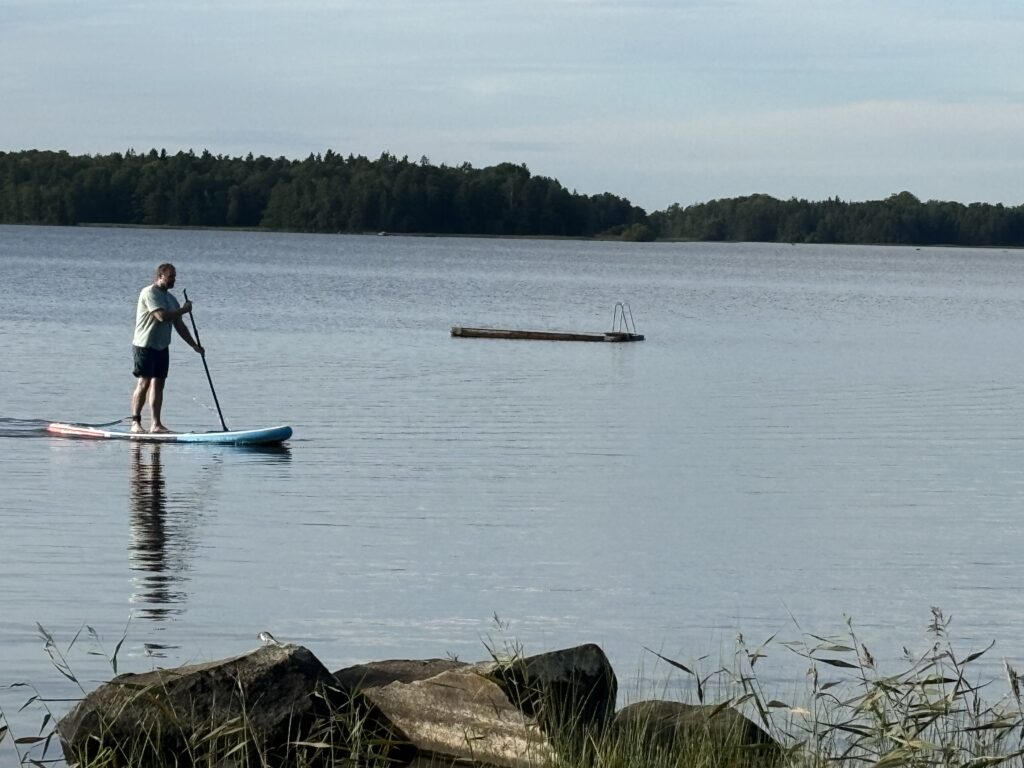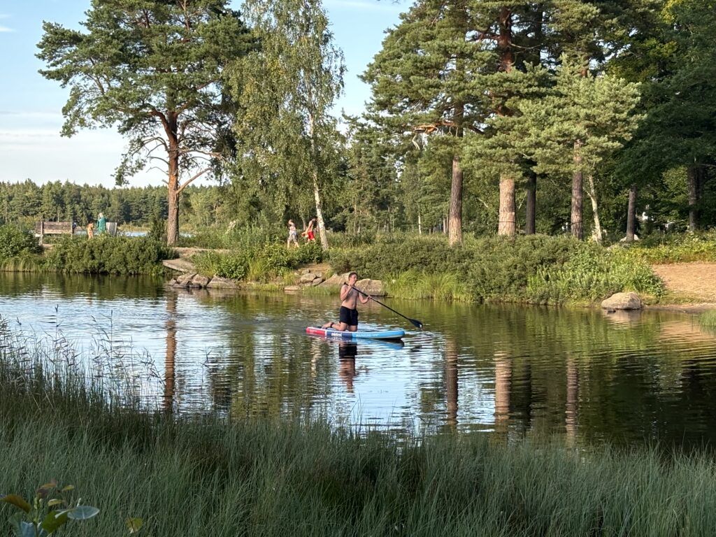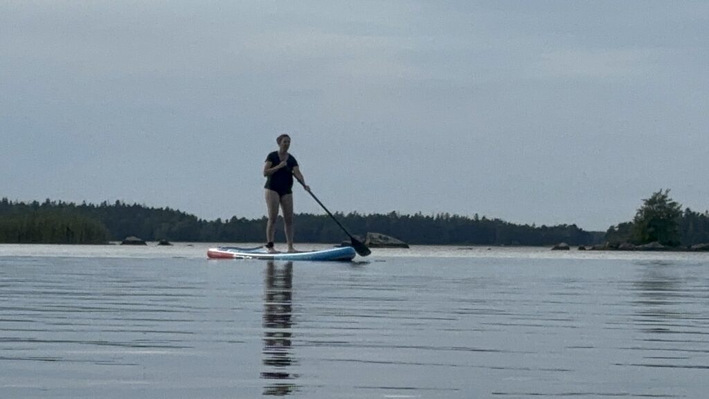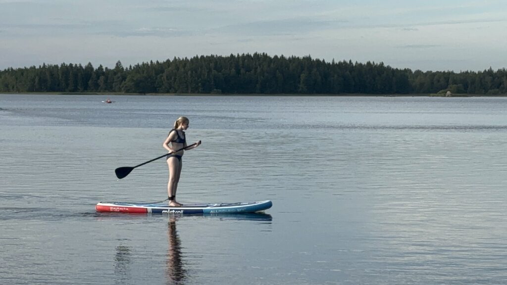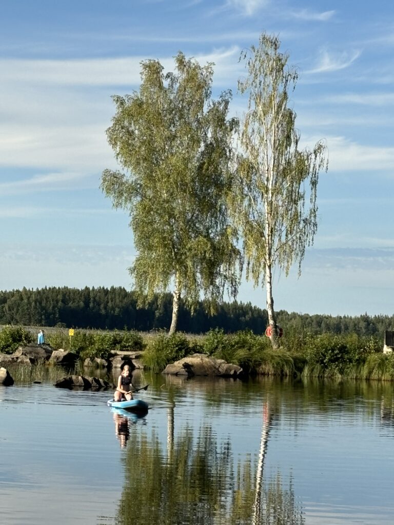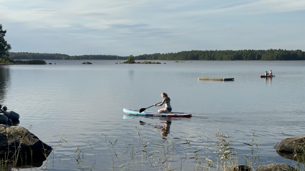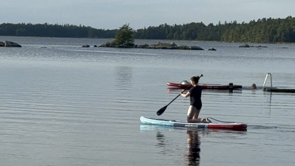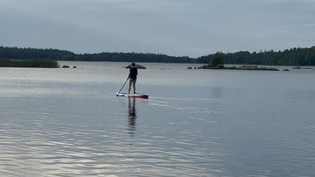 Mone hat in der Zwischenzeit Waffeln vorbereitet, die wir mit Moltebeerenmarmelade und Sahne genießen. Danach packen wir das SUP aus. Es sieht wirklich sehr hochwertig aus, und alles ist dabei. Sogar eine Kajakfunktion ist integriert. Das Paddel kann man umbauen, entweder so, wie man es fürs Stand-Up-Paddling braucht, oder fürs Kajakfahren. Nacheinander trauen wir uns alle hinaus auf das Board und ins Wasser. Nachdem wir zunächst noch etwas vorsichtig sind, werden wir alle mutiger und trauen uns auch weiter vom Ufer weg. Es macht super viel Spaß, und schon jetzt hat sich die Investition richtig gelohnt.