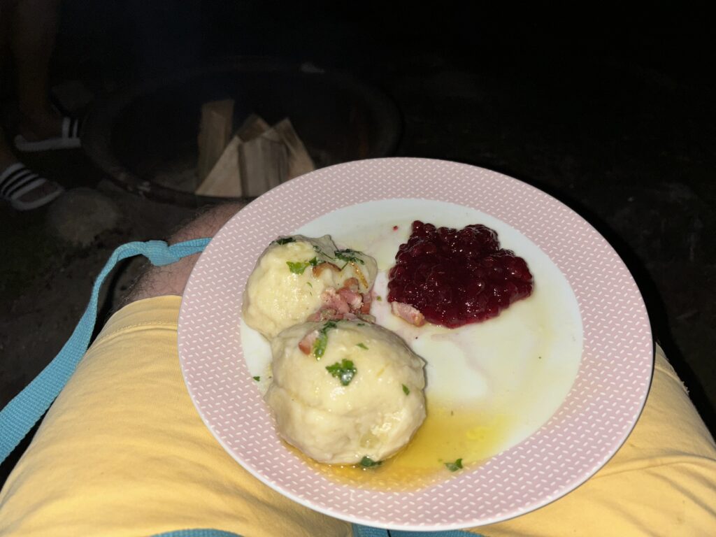 Während Linus und Mone schon zum Kochen zurück zur Molly gehen, machen Ida und Thorsten noch eine letzte Runde auf dem SUP. Das Kochen dauert etwas länger als normalerweise, und das nicht ohne Grund. Denn, Überraschung, es gibt Kroppkakor, die öländische Spezialität, und das ist richtig viel Arbeit. Zwischendrin verzweifeln Linus und Mone ein bisschen und fluchen mehrmals lautstark aus der Molly heraus. Aber schließlich entzünden wir ein kleines Lagerfeuer und essen am Feuer die selbstgemachten Kroppkakor. Die erste Runde hat auch sehr gut geklappt. Bei der zweiten Runde haben sich die schönen Klöße etwas aufgelöst, sodass sie nicht ganz rund und fest geblieben sind, aber dennoch hervorragend schmecken.